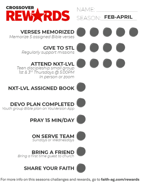 An incentive program for our youth group where students are challenged to complete specific, measurable goals related to faith, church, and the Bible. When students do complete these different milestones, they are rewarded!